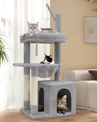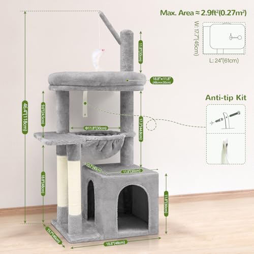 Compact Cat Tree Tower 46″ Condo w/ Scratching Posts & Hammock – Gray