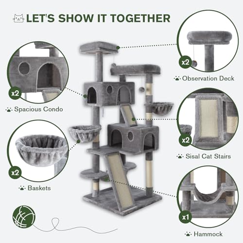 Elevate your cat’s playtime with this 66-inch multi-level paradise! Plush perches, sisal scratching posts, hammock, and cozy baskets provide ultimate comfort and entertainment for indoor big cats. Sturdy design keeps felines active and happy.