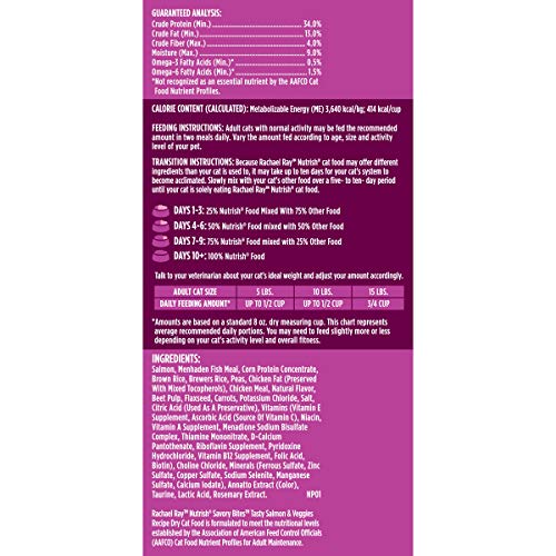 After an in-depth look at Rachael Ray Nutrish Savory Bites Dry Cat Food, Tasty Salmon & Veggies Recipe, it’s clear that this product stands out for its high-quality ingredients and nutritional value. My cats genuinely enjoyed the taste and texture, confirming many positive customer reviews. The absence of by-product meals, wheat, and soy is an added bonus that enhances its appeal, especially for health-conscious pet owners. Ready to give your feline friend a taste of something nutritious and delicious? Head over to your local pet store or shop online to try out this fantastic cat food. Your kitty will thank you!