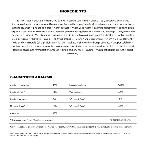 In conclusion, the Go! Solutions Digestion + Gut Health, Dry Cat Food, Salmon Recipe with Ancient Grains, 16 lb Bag provides a comprehensive blend of essential nutrients tailored to support your cat’s unique dietary requirements. Whether addressing digestive health, providing quality protein, or enhancing skin and coat conditions, this formula is a promising option for conscientious cat owners.