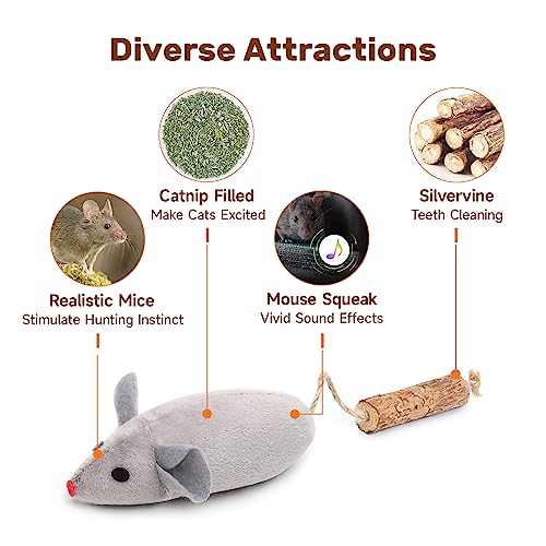 The Squeak Mice are equipped to turn playtime into a thrilling chase. These plush, squeaky toys mimic the sound of a lifelike mouse chirp as soon as your cat begins to pounce and play. The sound mechanism smartly shuts off when the toys are idle, ensuring battery longevity.