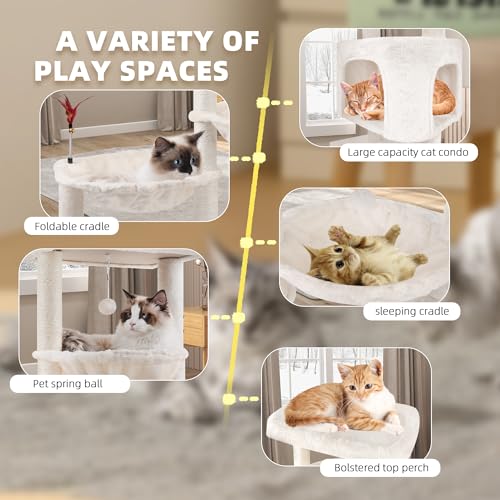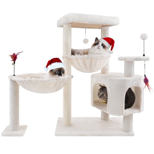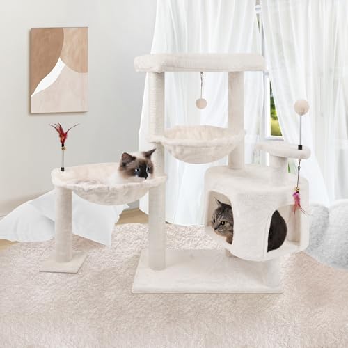 Create a cat paradise with the YOUPET 33.46″ Cat Tree Tower! Featuring a cozy condo, sturdy scratching post, two plush hammocks, and playful spring toy balls. The perfect indoor retreat for feline comfort and entertainment.