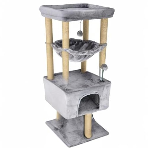 Elevate your cat’s comfort with this stylish 43.3″ grey cat tree featuring cozy houses, plush perches, and sturdy design for ultimate feline relaxation and playful adventures.